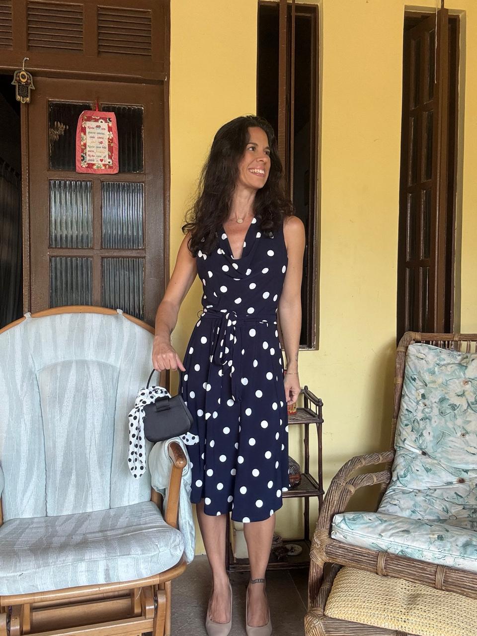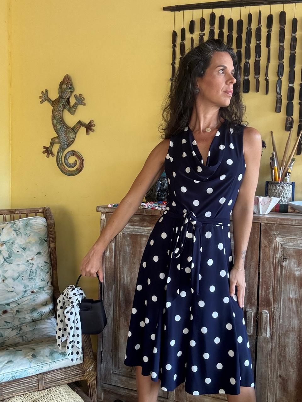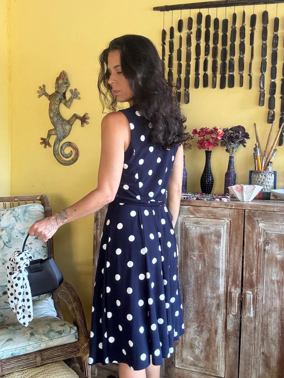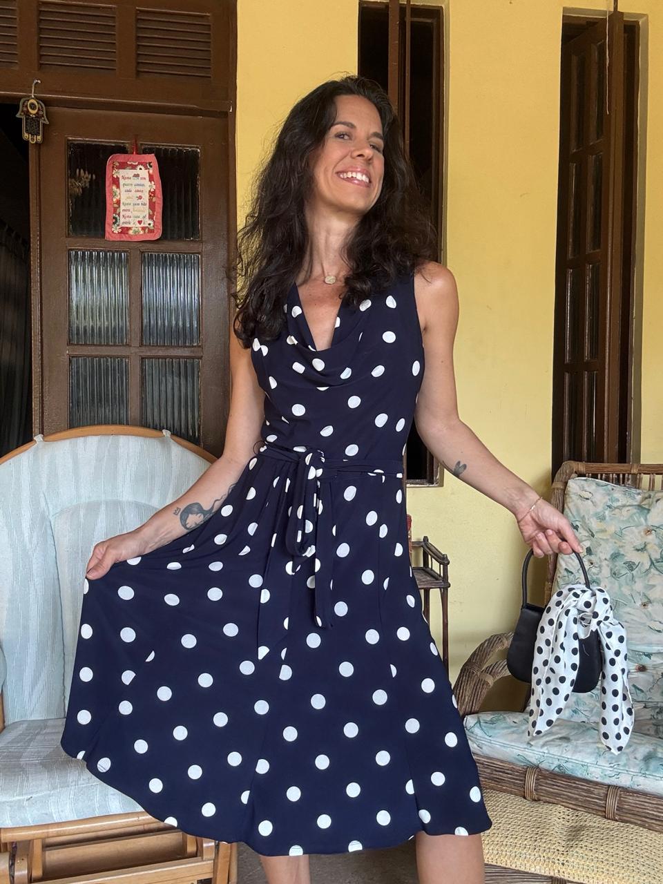 Vestido midi azul-marinho com estampa poá branca em tecido de malha leve e fluido. Apresenta decote em cascata (drapeado cowl neck), cintura marcada com faixa e saia evasê, oferecendo um visual clássico, retrô e super feminino.