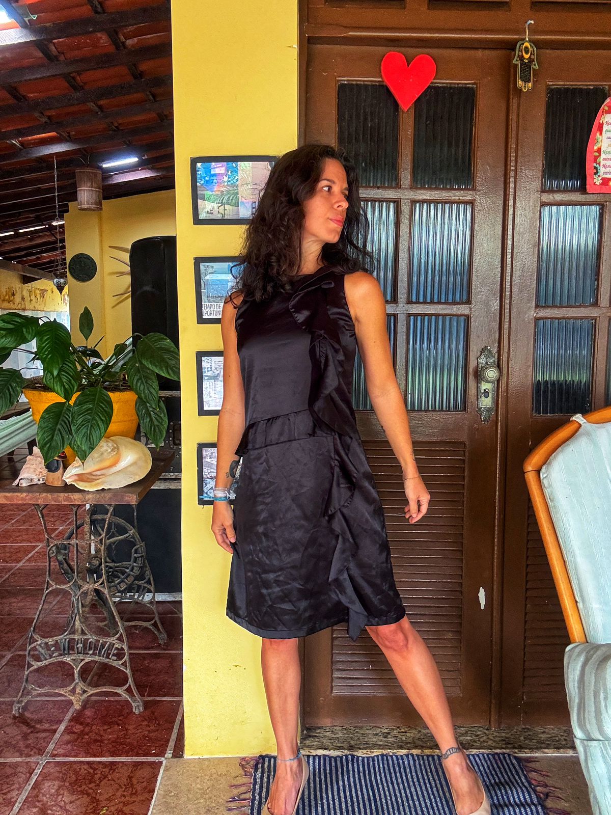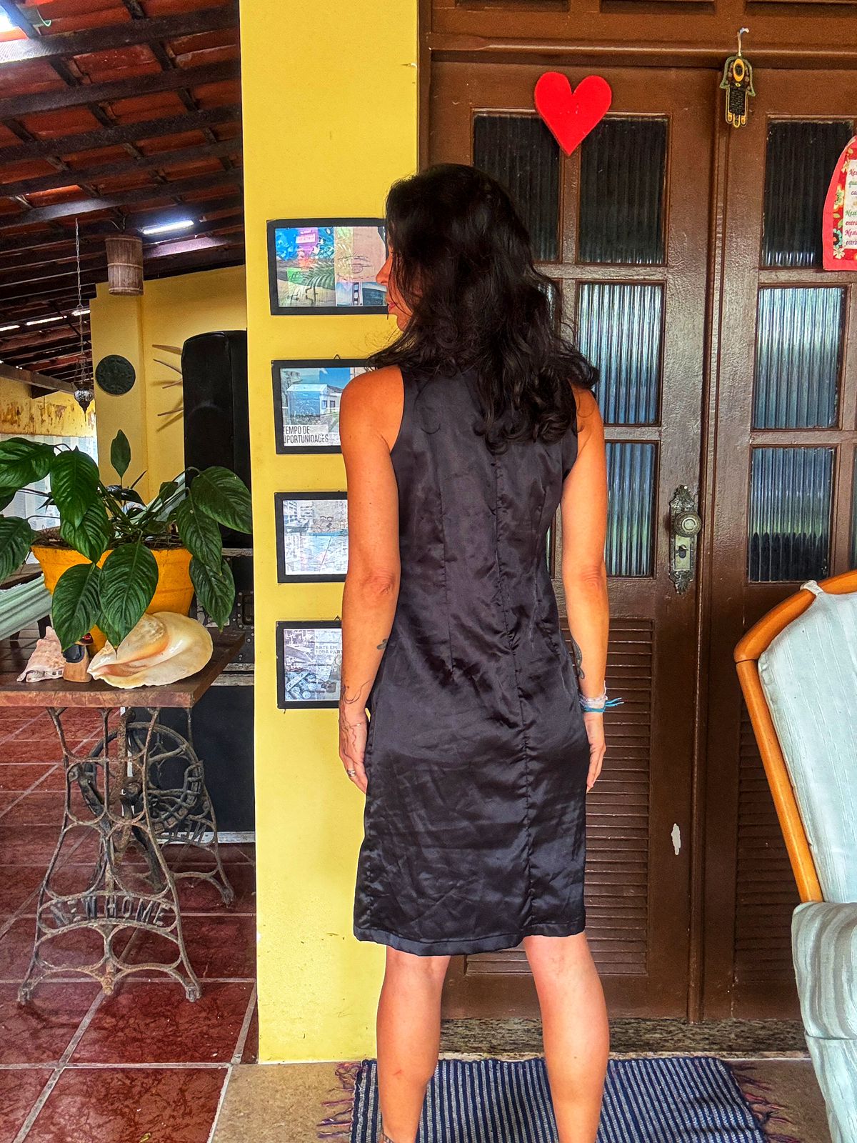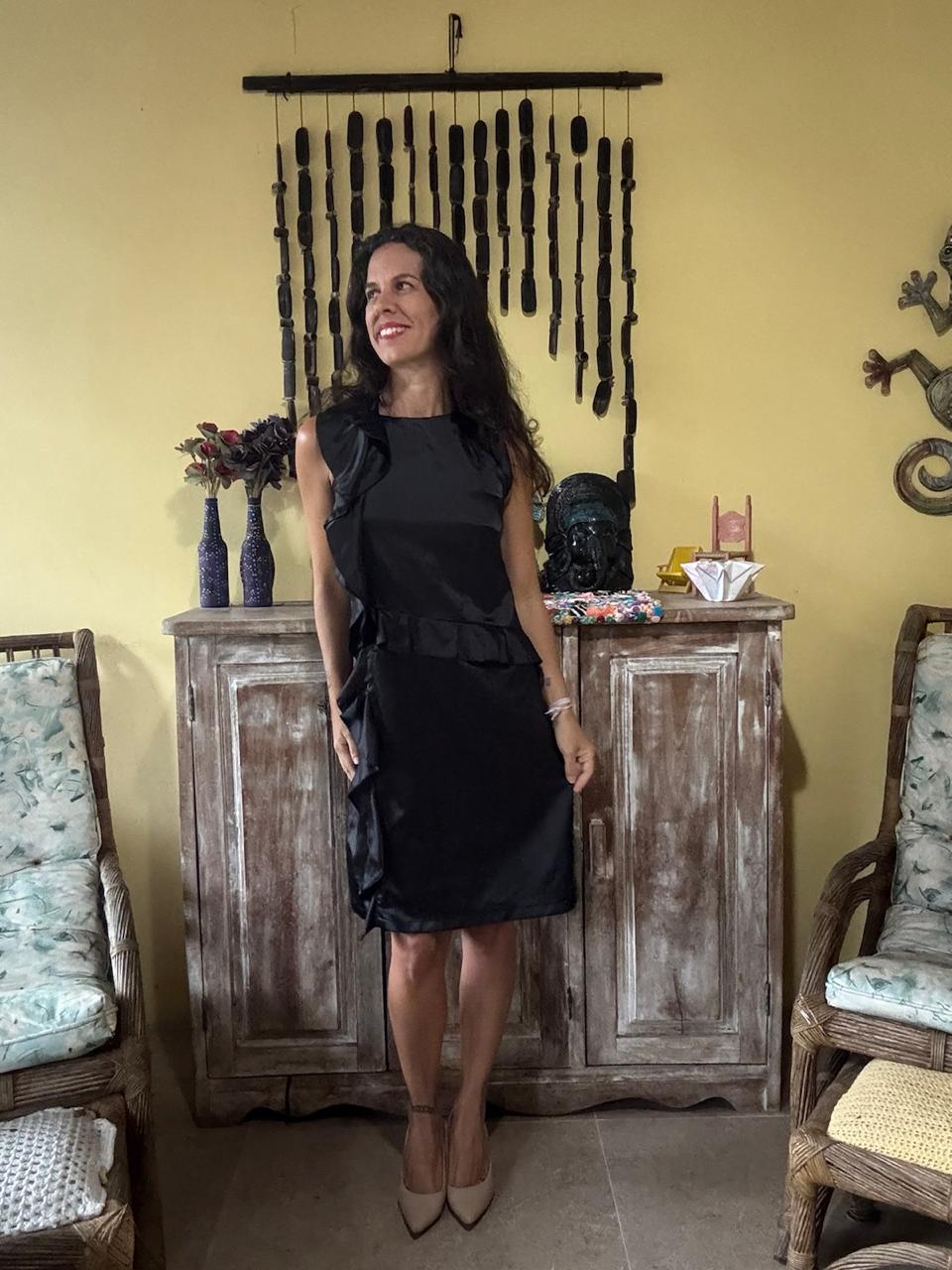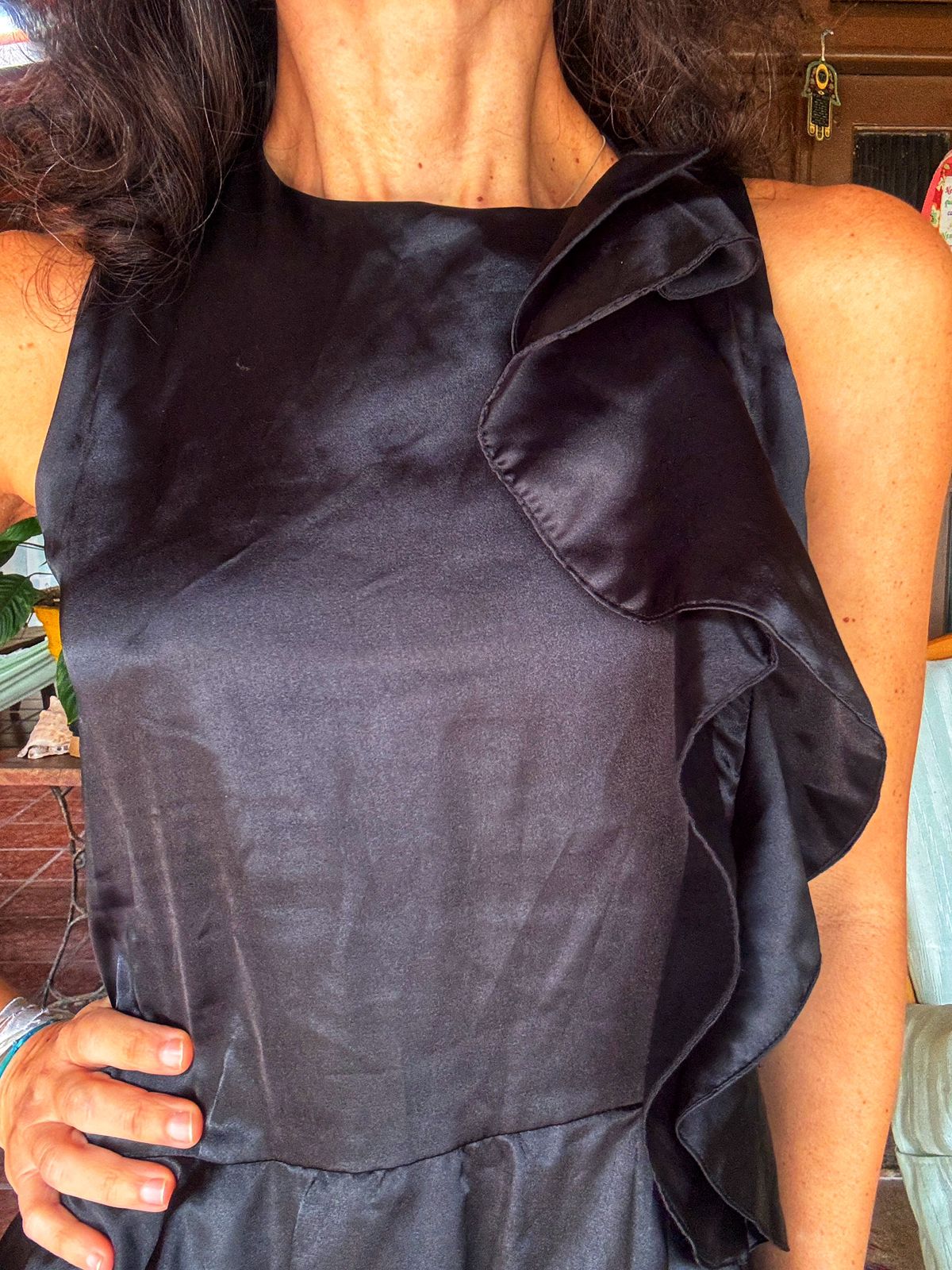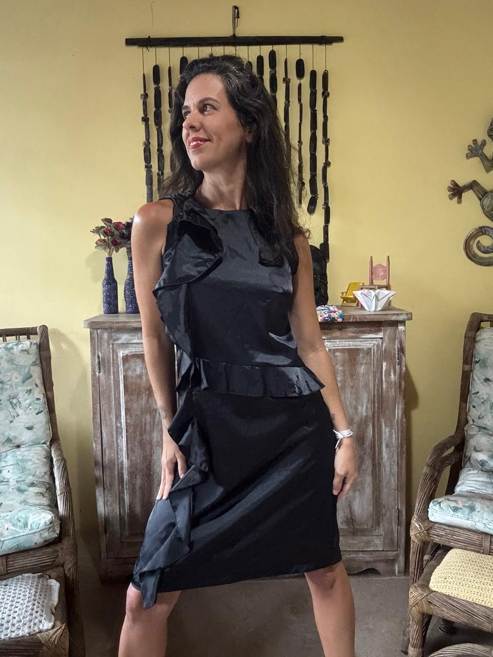 Vestido preto de tecido acetinado com babados cascata laterais, uma peça elegante e fluida que adiciona movimento e sofisticação ao visual. Com decote redondo e sem mangas, é perfeito para ocasiões especiais em Lauro de Freitas e que pedem um toque de glamour.