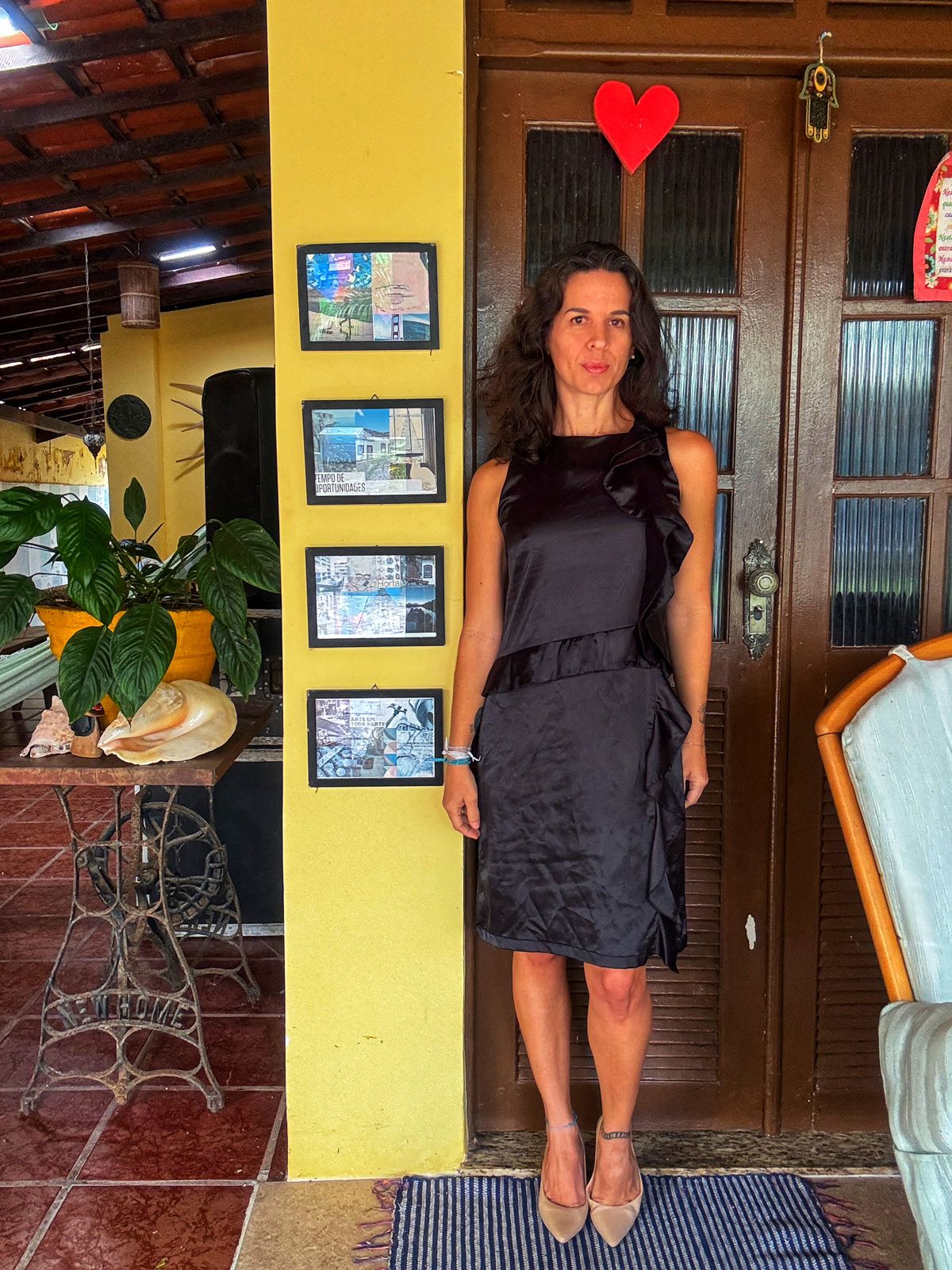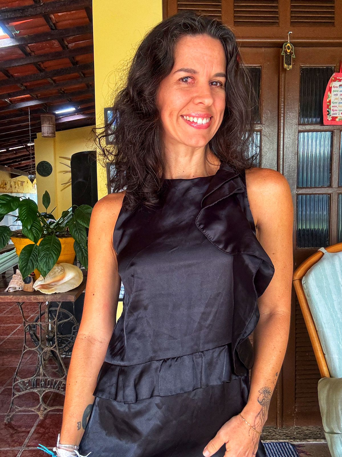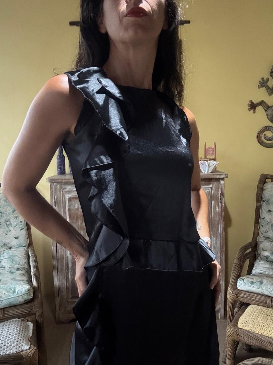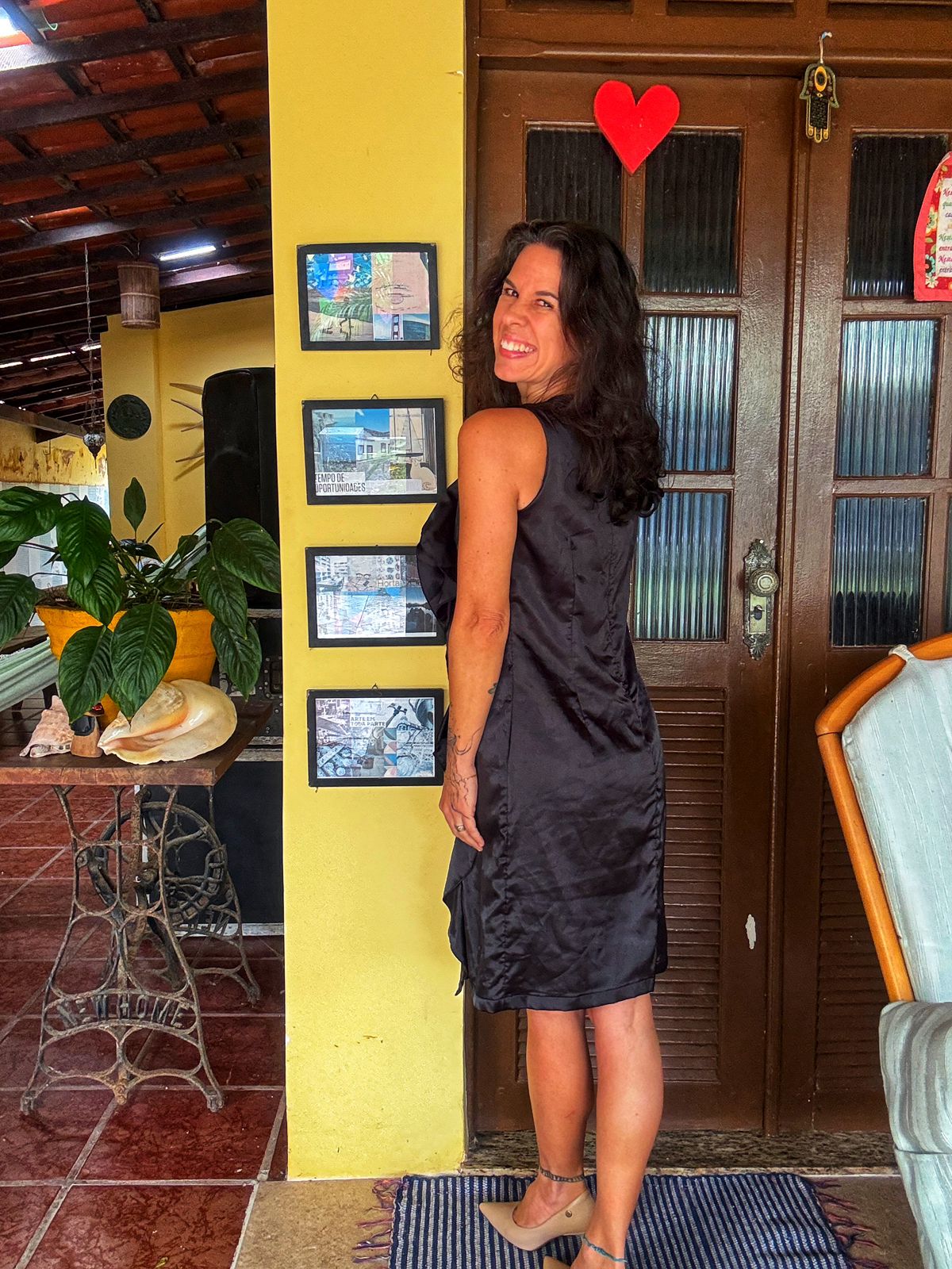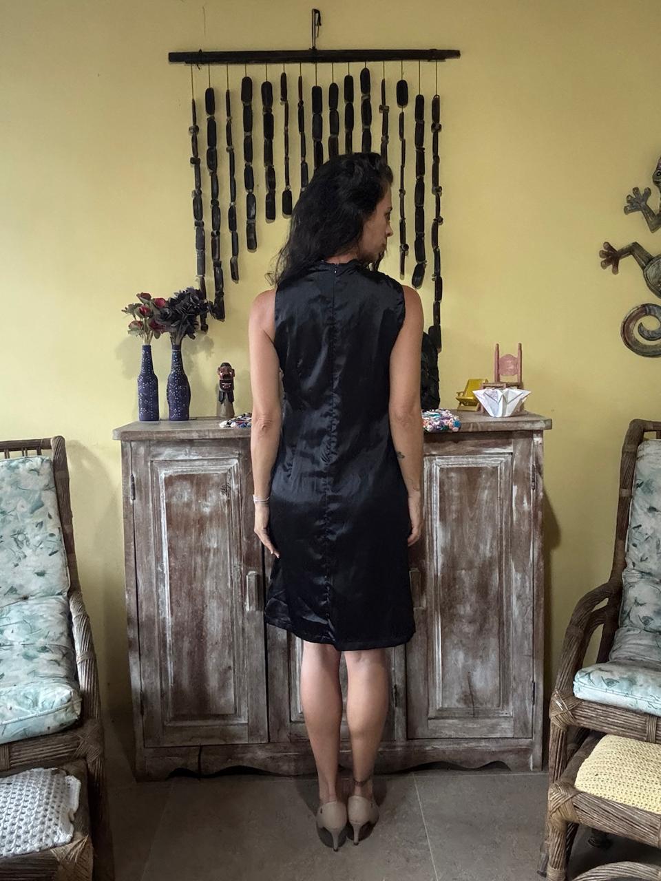 Vestido preto de tecido acetinado com babados cascata laterais, uma peça elegante e fluida que adiciona movimento e sofisticação ao visual. Com decote redondo e sem mangas, é perfeito para ocasiões especiais em Lauro de Freitas e que pedem um toque de glamour.