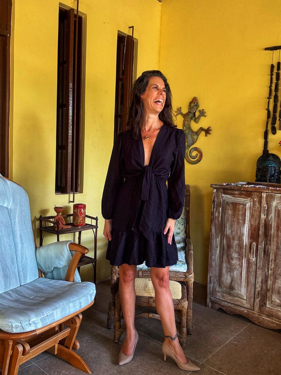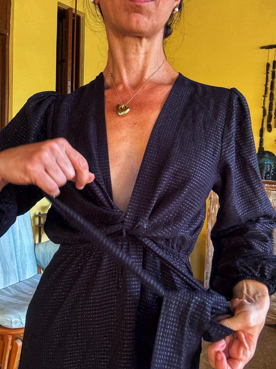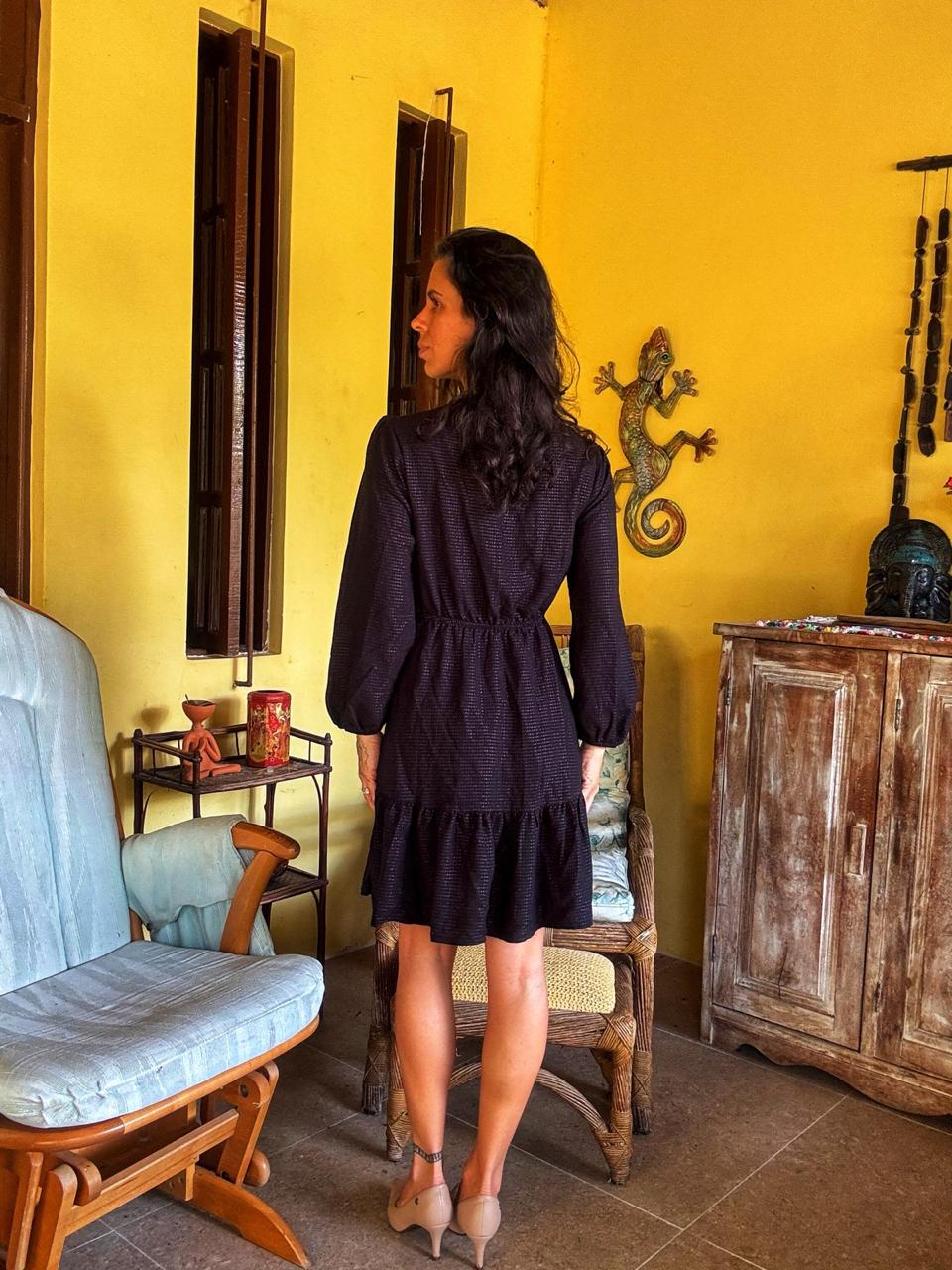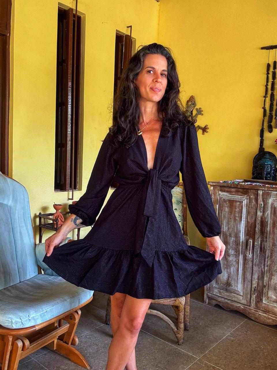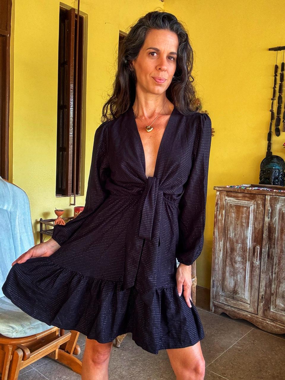 Mini vestido preto de manga longa com tecido texturizado/poá em lurex discreto, apresentando um decote V profundo e amarração frontal na cintura, que cria um efeito wrap e valoriza a silhueta. A barra com babado confere movimento e um toque festivo.