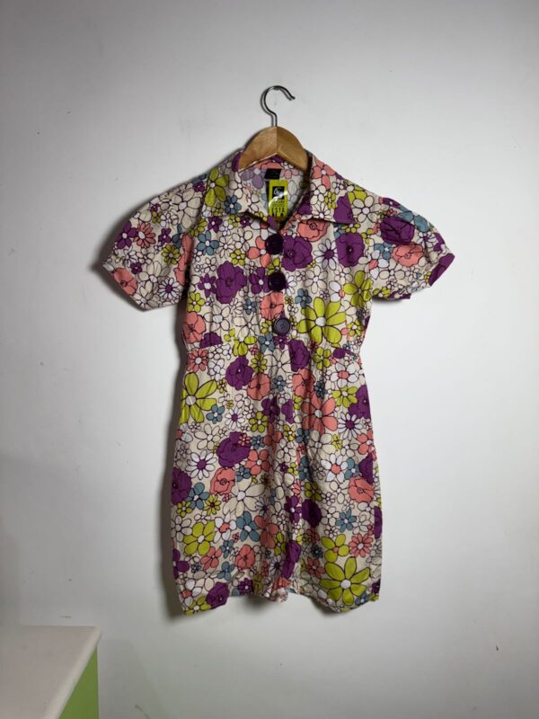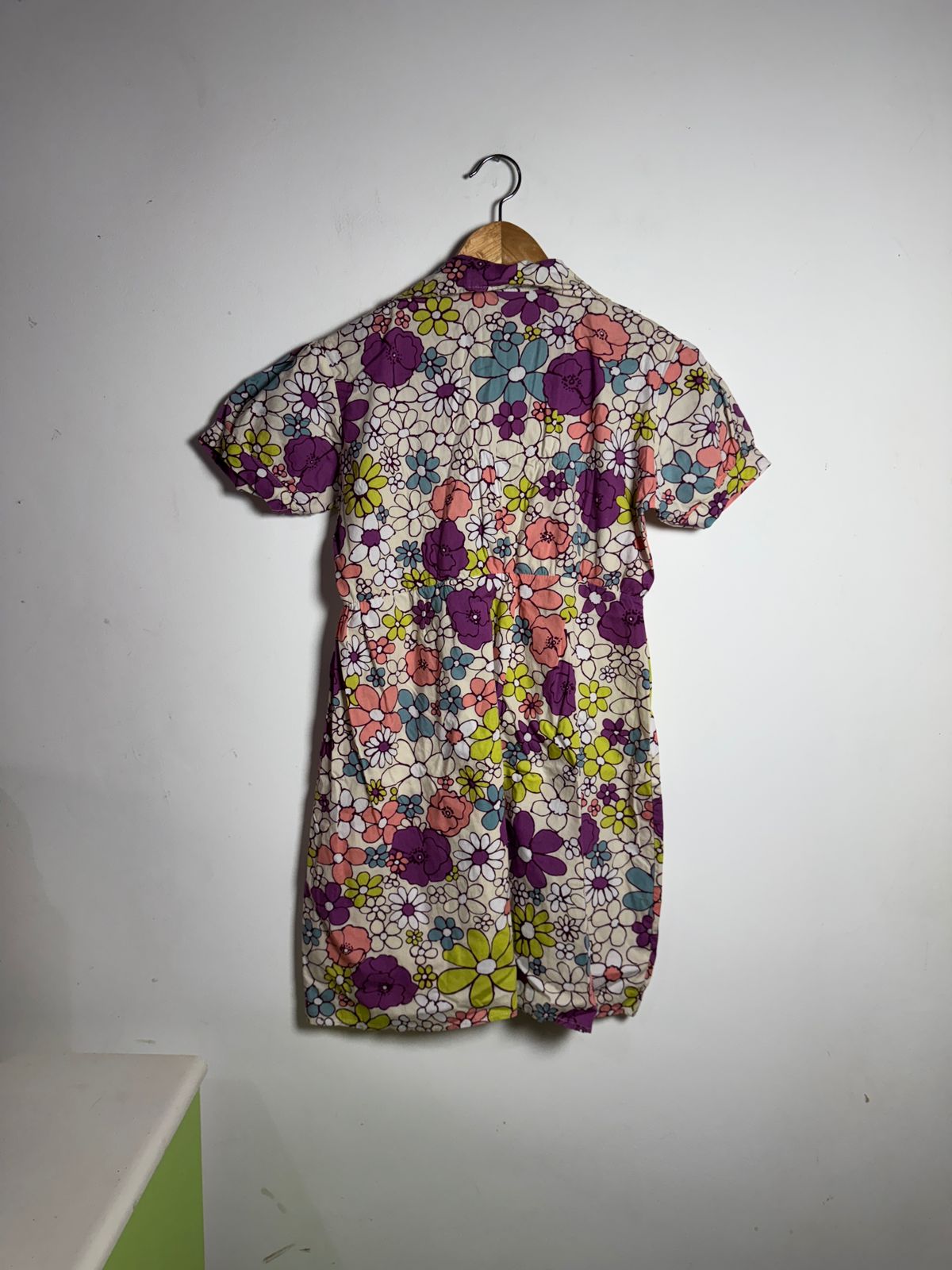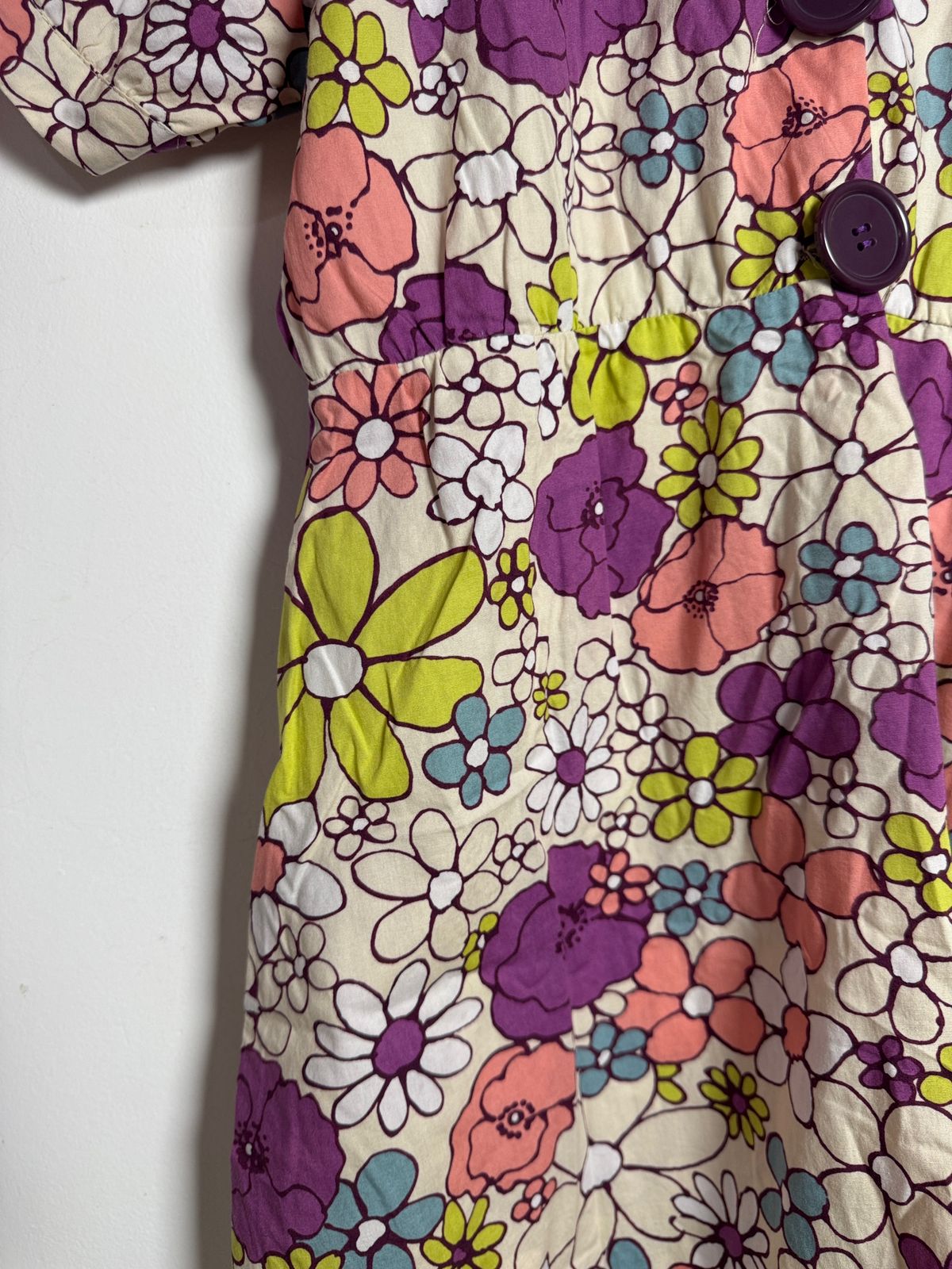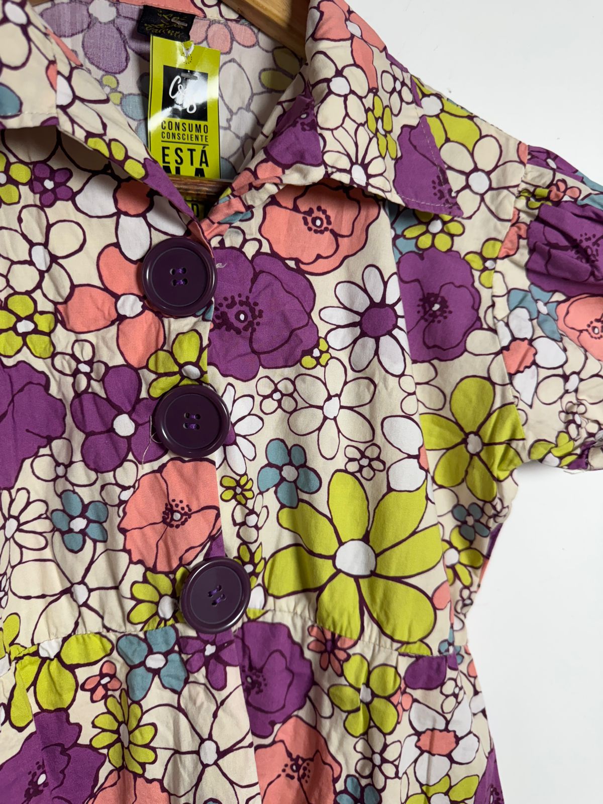 Vestido Retrô Floral Estilo Chemise em Algodão: Estampa vibrante com gola e botões roxos, cintura marcada com elástico e barra levemente bufante. Um charme divertido e vintage dos anos 60!