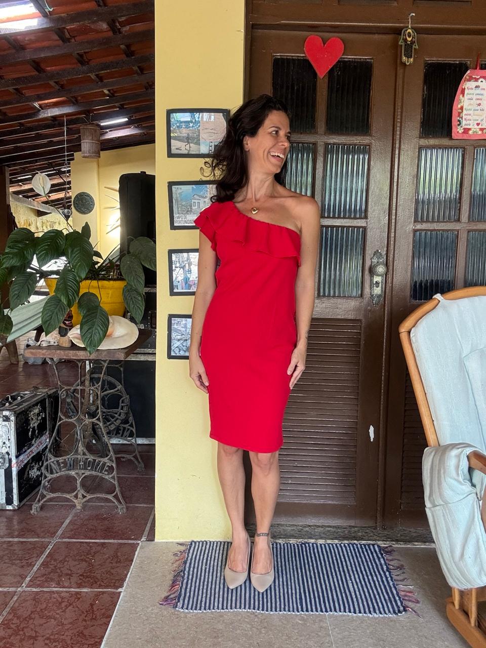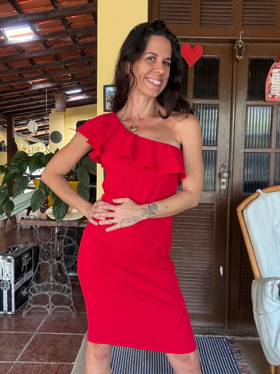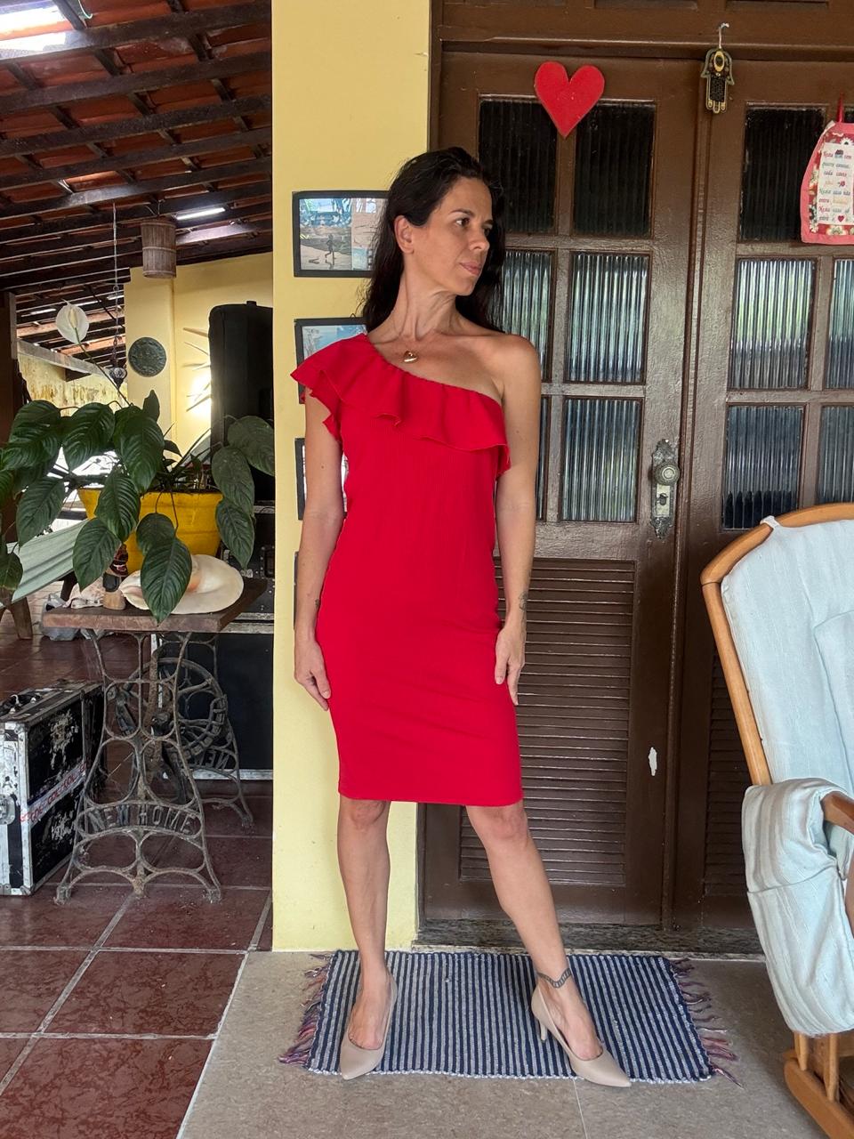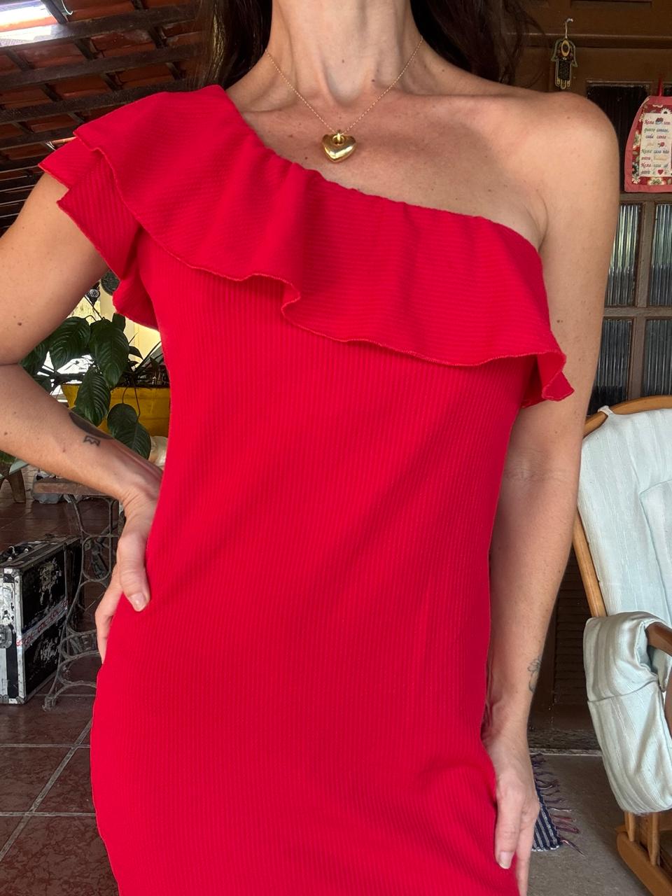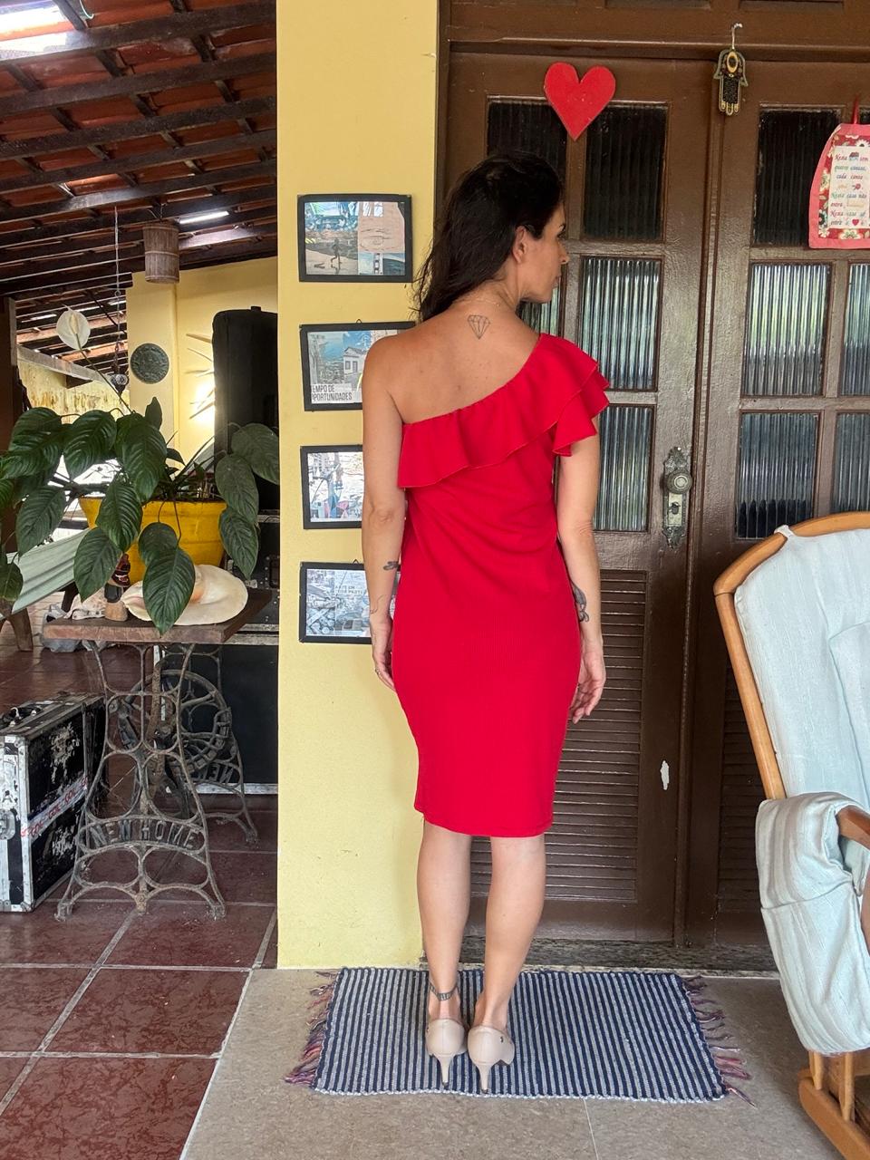 Vestido tubinho vermelho em malha canelada que valoriza a silhueta. Possui corte um ombro só e babado cascata no decote, perfeito para um evento noturno, garantindo um visual sensual e moderno.