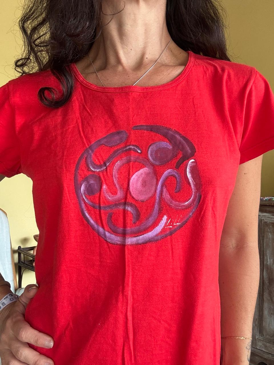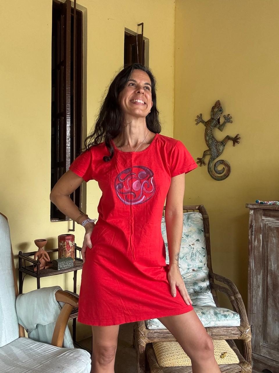 Vestido camiseta de malha vermelha vibrante, com modelagem soltinha e pintura circular exclusiva à mão em tons de roxo e pink. Uma peça única de brechó que une conforto e arte, ideal para um visual descontraído e cheio de personalidade.